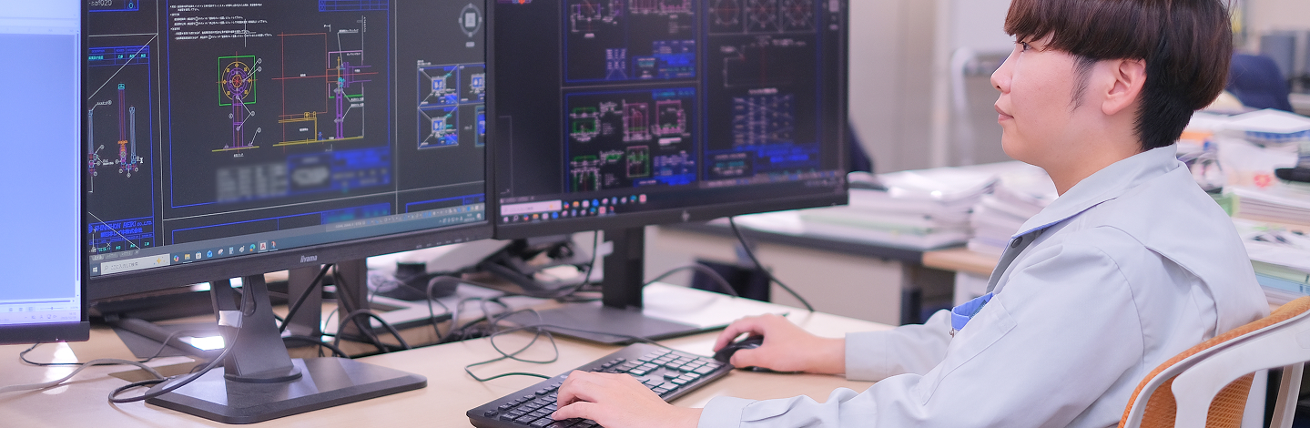 受注前の段階では、営業からの依頼を受けて最適な機種や購入品の選定を行う「概略設計」を。受注後は、製造に必要な製作図や部品リストを作成する「詳細設計」を行います。カタログ品をただ売るのではなく、設置環境や条件に合わせてカスタマイズしていく、エンジニアとしての腕が試される仕事です。